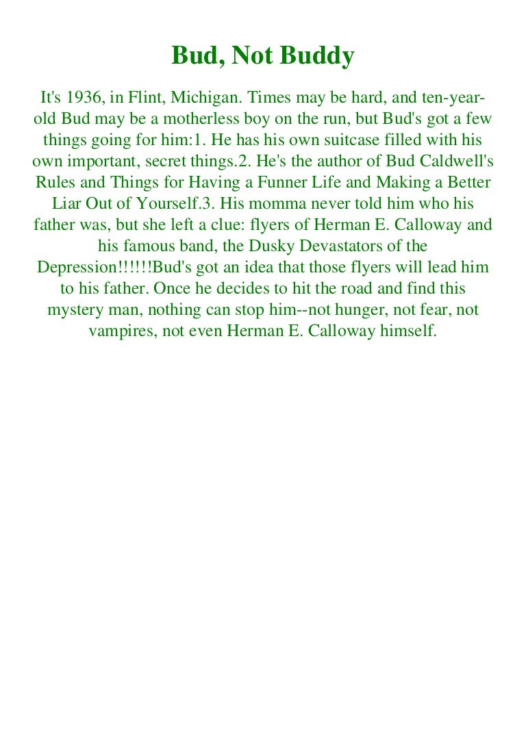 G8_bud_not_buddy_-_950l Identifier-ark ark13960t9g54pb13 Ocr tesseract 411 Ocr_autonomous true Ocr_detected_lang en. Free download or read online Bud Not Buddy pdf ePUB.